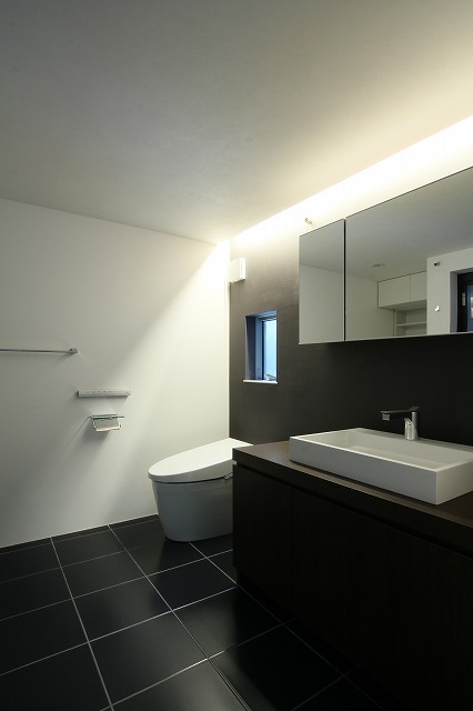 間接照明でホテルライクにまとめたシックなパウダールーム