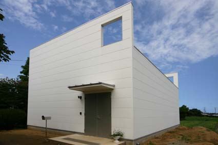 窓の無いソリッドな外観、四角い開口は風抜き用の穴