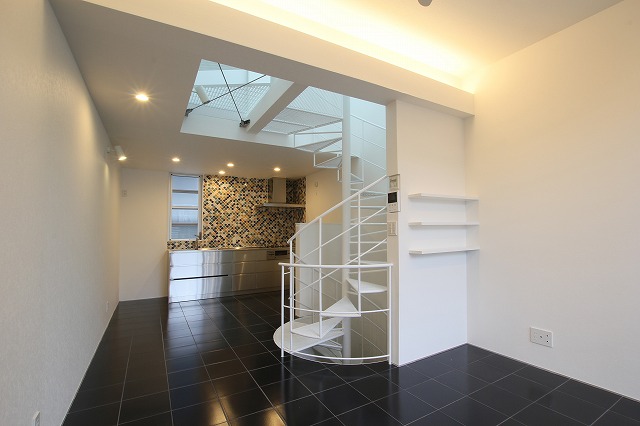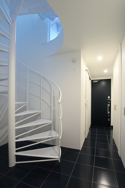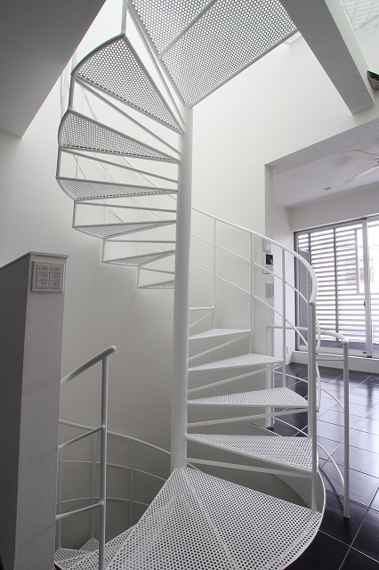 鉄骨階段は螺旋階段で踏板はパンチングメタル