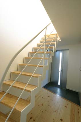 玄関ホールには鉄骨のスレンダーな階段が架かる