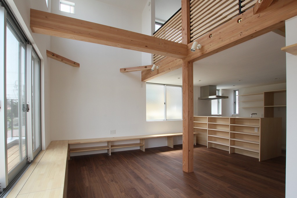 上部は吹抜で開放的なリビングを囲うように造作されたベンチは収納にもなっている