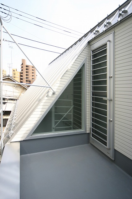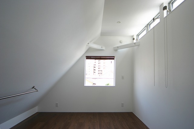 吹抜けの三角窓よりリビングに光を落とす