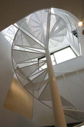 右側に見えるらせん階段は屋上まで伸びている