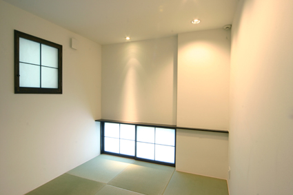 床は琉球タタミ、白と黒のアクセントで現代風の仕上り