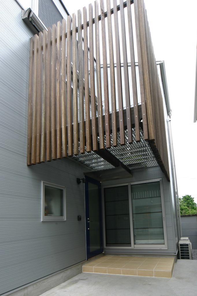 木製ルーバーがアクセントになっている
