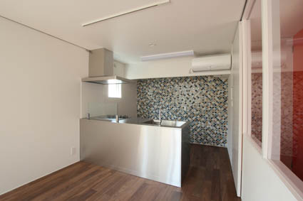 背面のタイルが特徴的な特注ステンレスキッチン